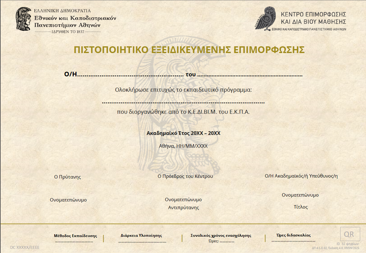Η παρακολούθηση του προγράμματος οδηγεί στη χορήγηση Πιστοποιητικού Επιμόρφωσης από το Εθνικό και Καποδιστριακό Πανεπιστήμιο Αθηνών. Το πρόγραμμα διεξάγεται σύμφωνα με τις προδιαγραφές του Υπουργείου Παιδείας.